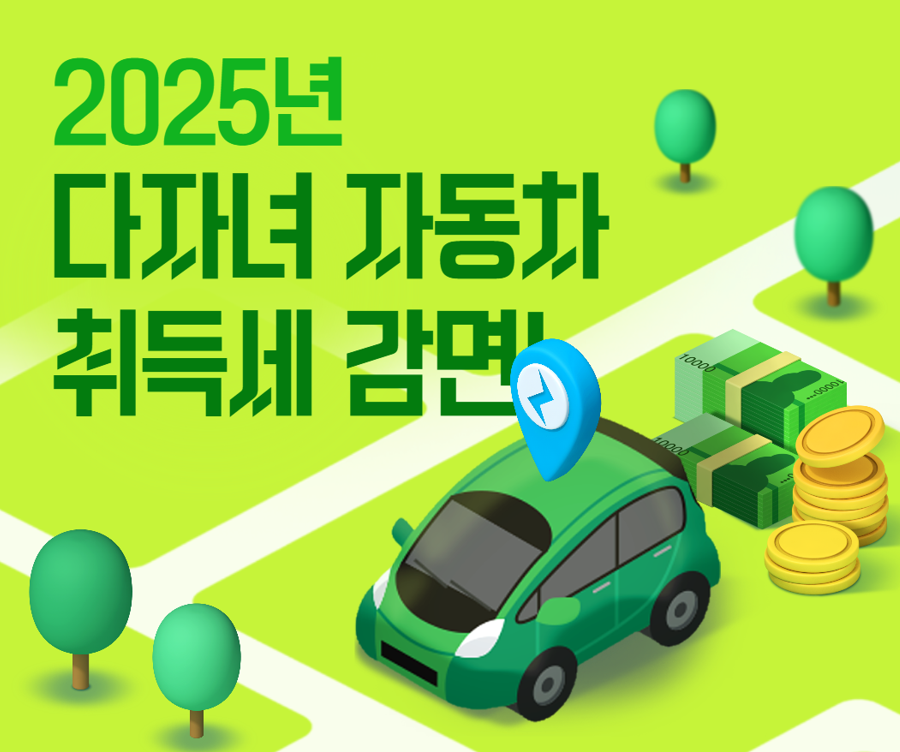 - 다자녀(2명 이상) 가구가 자동차를 구입할 경우 취득세 일부 또는 전액 감면 혜택을 받을 수 있습니다.