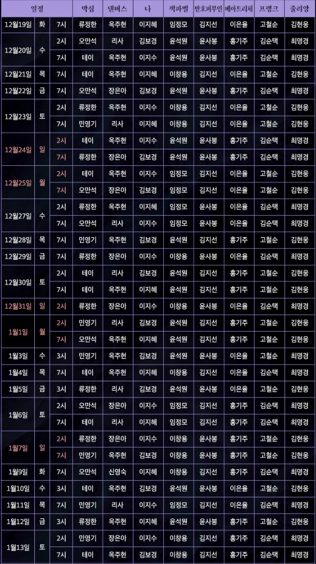 뮤지컬 캐스팅에 대한 일정을 보시고 관람하시면 더 만족스러운 관람이 될 수 있으니 참고하시기 바랍니다. 공연 스케줄은 배우 및 제작사의 사정에 의해 사전 공지 없이 변경 될 수 있습니다.