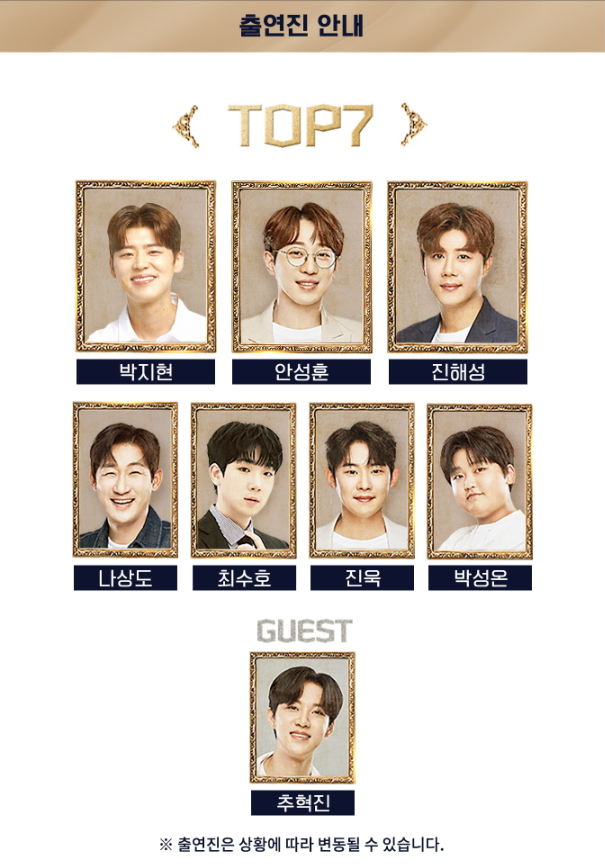 미스터트롯2 TOP7은 박지현, 안성훈, 진해성, 나상도, 최수호, 진욱, 박성온이며, 게스트로는 추혁진으로 구성됩니다. 참고로 출연진은 상황에 따라 변동될 수 있으니 참고하시기 바랍니다.