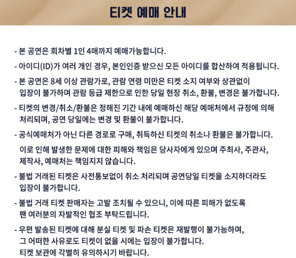 본 공연은 회차별 1인 4매까지 예매가능합니다. 8세 이상 관람가로 관람 연령 미만은 티켓 소지 여부와 상관없이 입장이 불가하오니 참고하시기 바랍니다. 상세한 내용은 아래 내용 참고하시기 바랍니다.