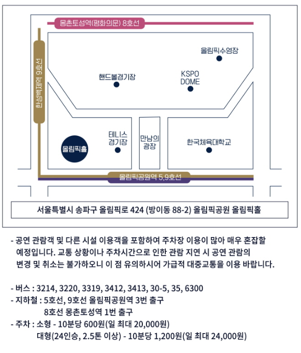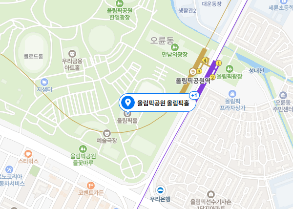 콘서트 공연장소는 올림픽공원 올림픽홀이며, 아래 안내에 따라 버스/지하철로 이동하시면 됩니다. 아래 지도를 클릭하면 네이버지도로 연결됩니다.
