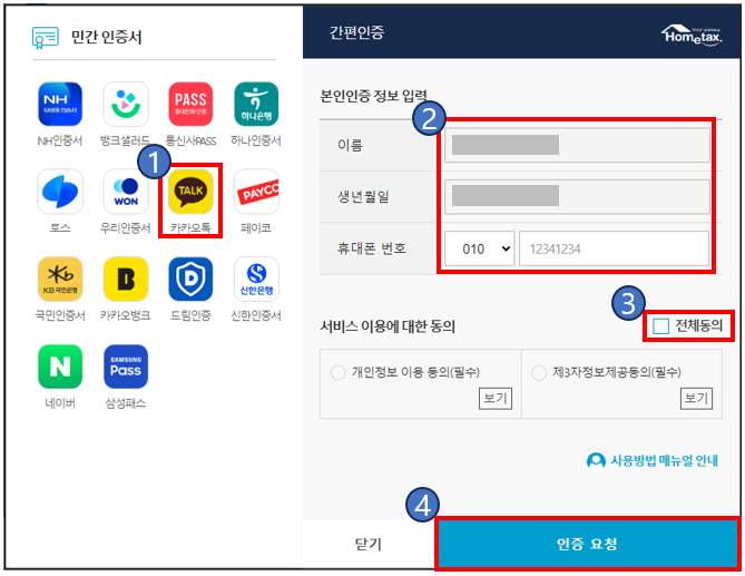 3. 간편인증에서 카카오톡을 선택하고, 이름과 생년월일 그리고 휴대폰 번호를 입력합니다. 그리고 전체 동의를 체크한 후