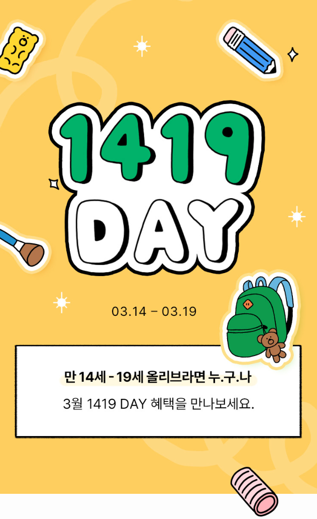 만 14세 - 19세 올리브라면 누구나 3월 1419 DAY 혜택을 만나보세요. 아래 QR코드를 통해서 지금 바로 올리브영 APP에서 확인해보세요.