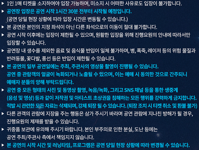 입장 및 공연 관람 시 유의해야 할 사항에 대해서는 아래 내용을 참고하시기 바랍니다.
