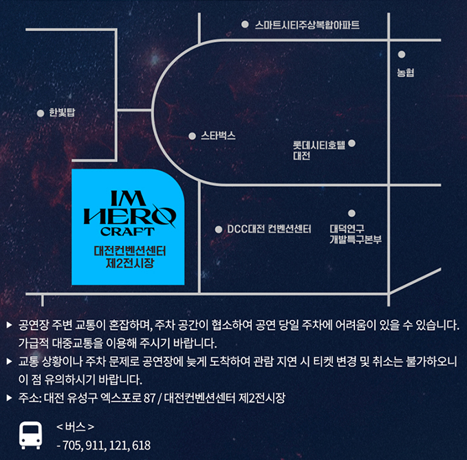 콘서트장 위치는 대전컨벤션센터 제2전시장이며, 공연장 주변 교통이 혼잡하오니 가급적 대중교통을 이용해 주시기 바랍니다.