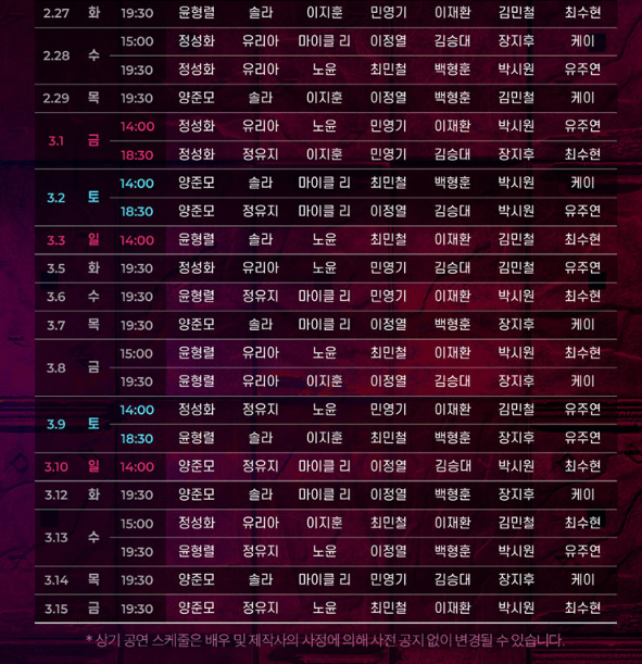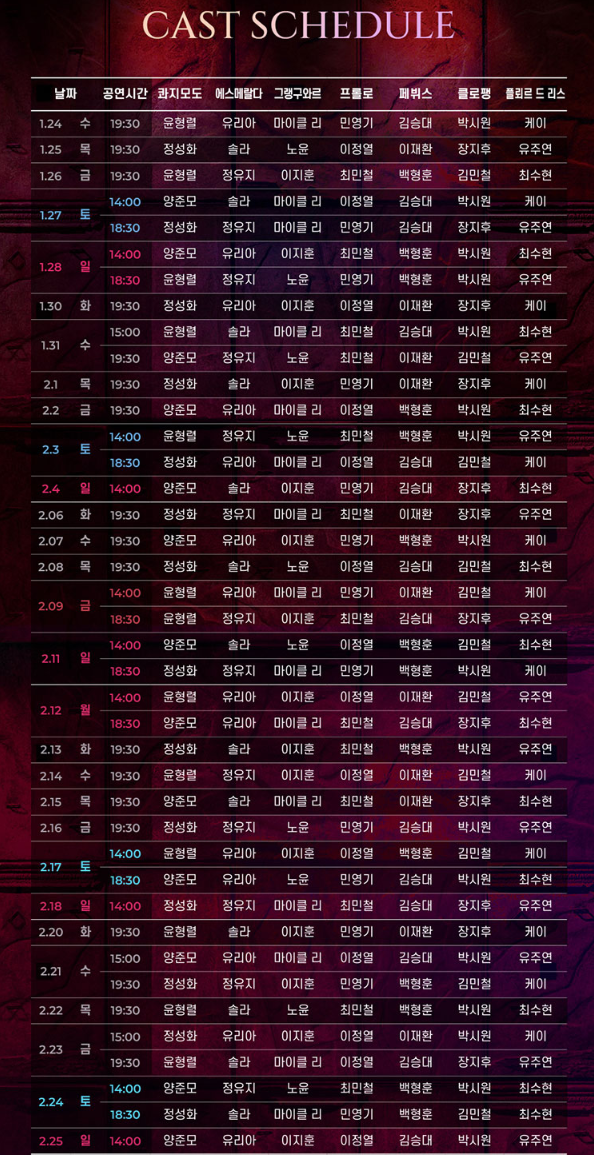 공연일정은 2024년 1월 24일부터 3월 24일까지이며, 자세한 사항은 아래 일정으로 확인하시기 바랍니다.