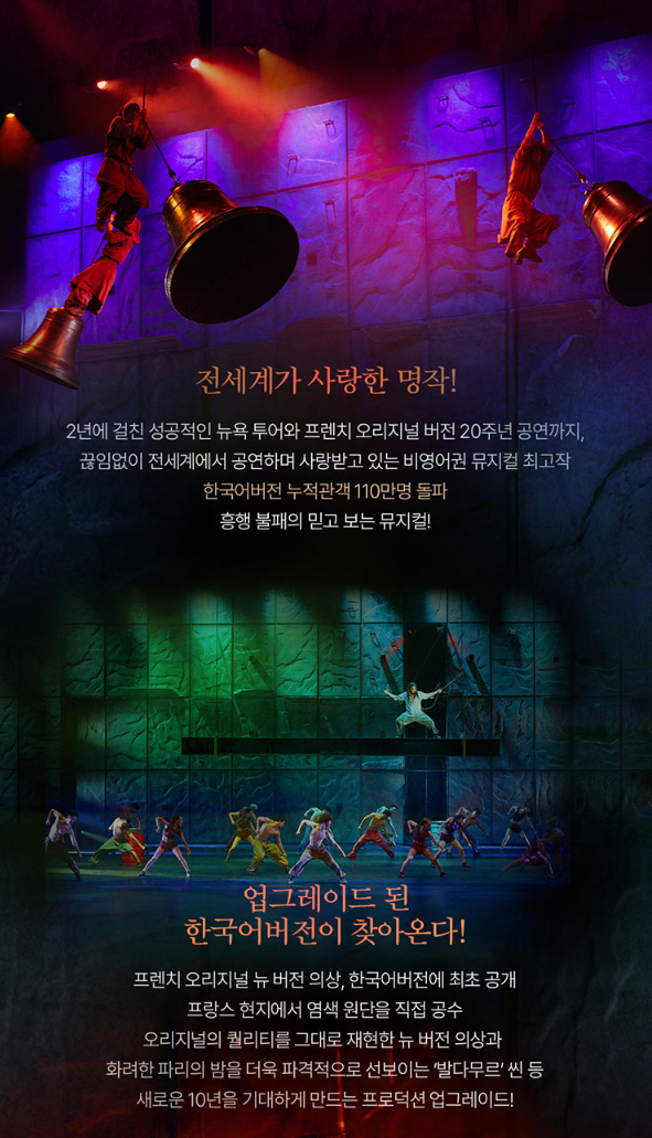 2년에 걸치 성공적인 뉴욕 투어와 프렌치 오리지널 버전 20주년 공연까지, 끊임없이 전세계에서 공연하며 사랑받고 있는 비영어권 뮤지컬 최고작입니다. 한국어버전 누적관객 110만명 돌파! 흥행 불패의 믿고 보는 뮤지컬!