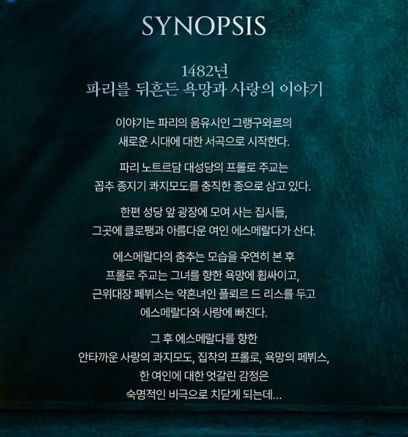 - 치명적인 아름다움의 집시여인 에스메랄다는 콰지모도, 프롤로, 페뷔스의 사랑, 집착, 욕망, 광기의 대상이 됩니다.